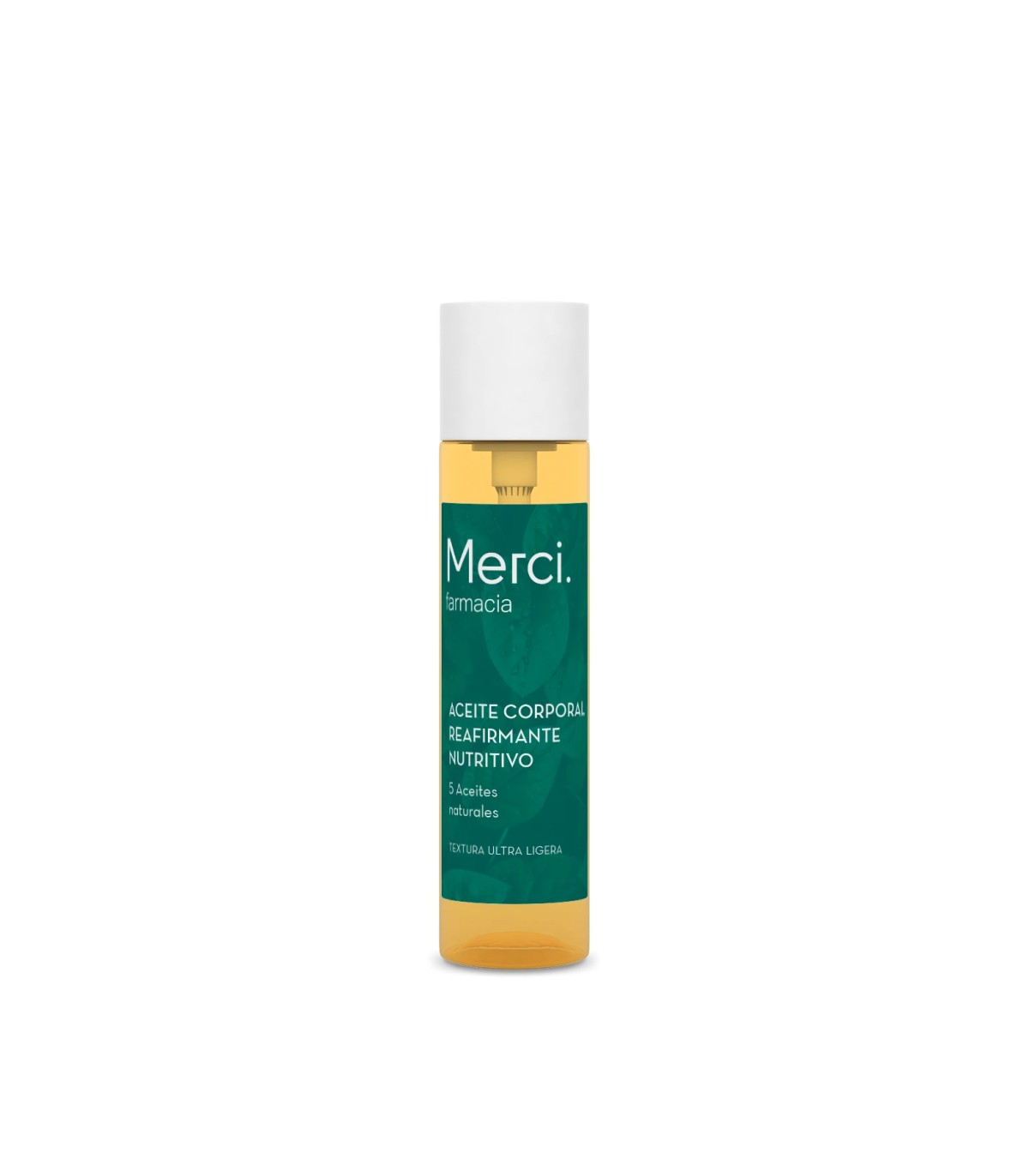 Aceite Corportal Reafirmante de Merci Farmacia. Con aceite de argán, indicado para firmeza y celulitis. 100 ml.
