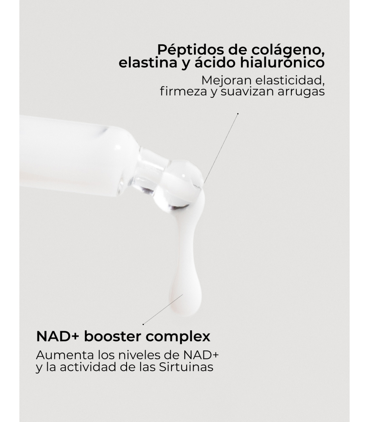 "Sérum facial antienvejecimiento con NAD⁺ y colágeno Firmeza inteligente: reactiva el colágeno y la energía celular mientras refuerza la función barrera y aumenta la longevidad de la piel.
