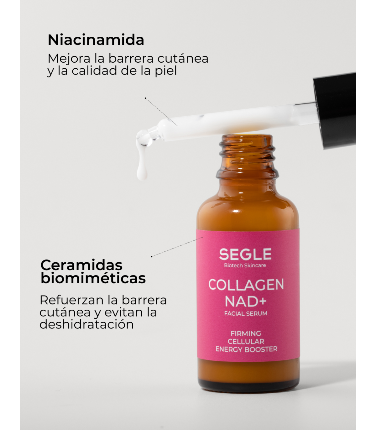 Sérum Collagen NAD+ de Segle. Con péptidos de colágeno, indicado para líneas de expresión y firmeza. 30 ml.