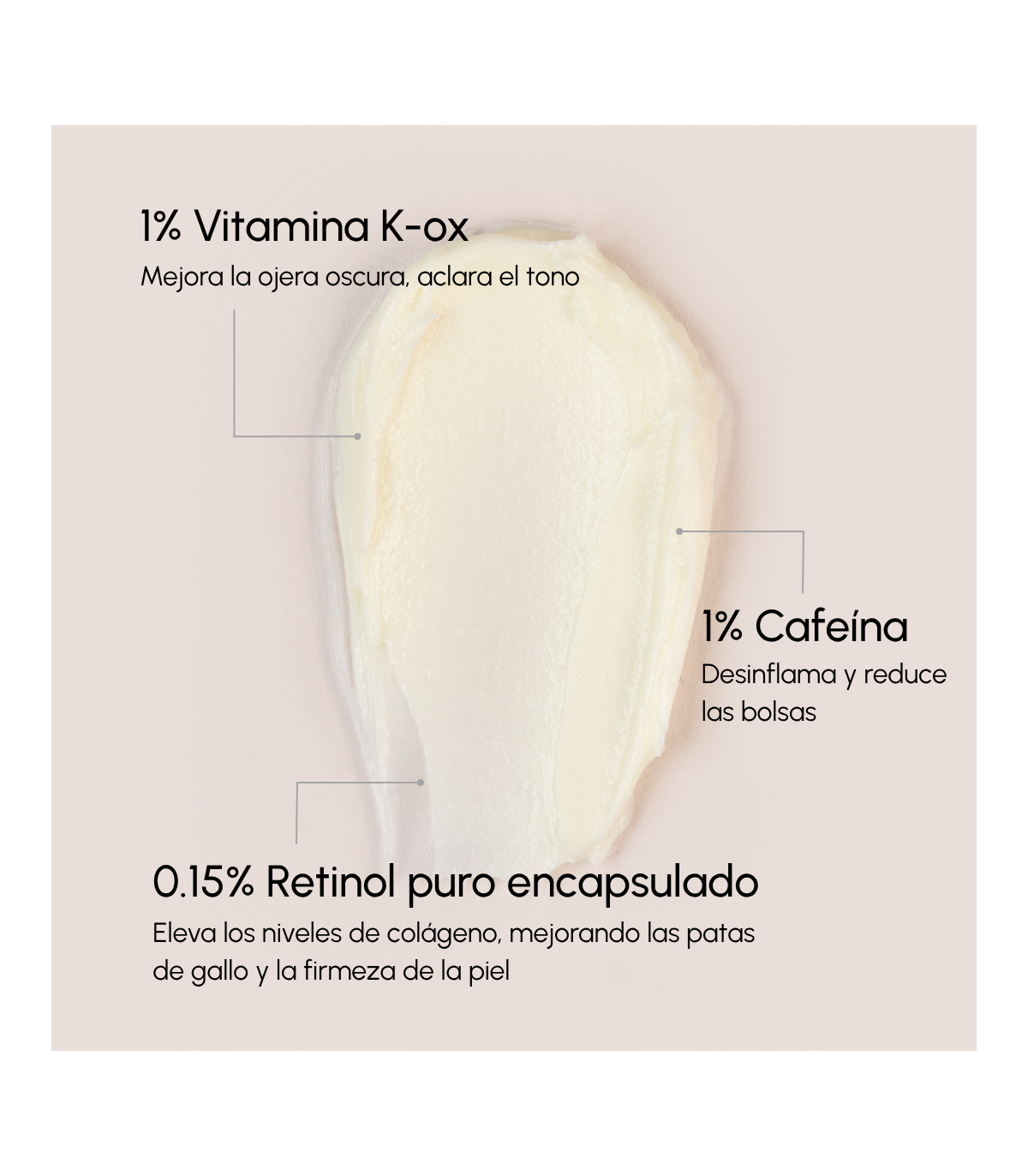 Contorno de ojos de acción global con retinol: formulado para mejorar la firmeza, reducir bolsas y atenuar ojeras. Con el uso continuado se reduce la pigmentación de las ojeras, se suavizan arrugas y disminuyen las bolsas gracias a su fórmula con cafeína. Además, también mejora la firmeza en la zona del contorno de ojos.