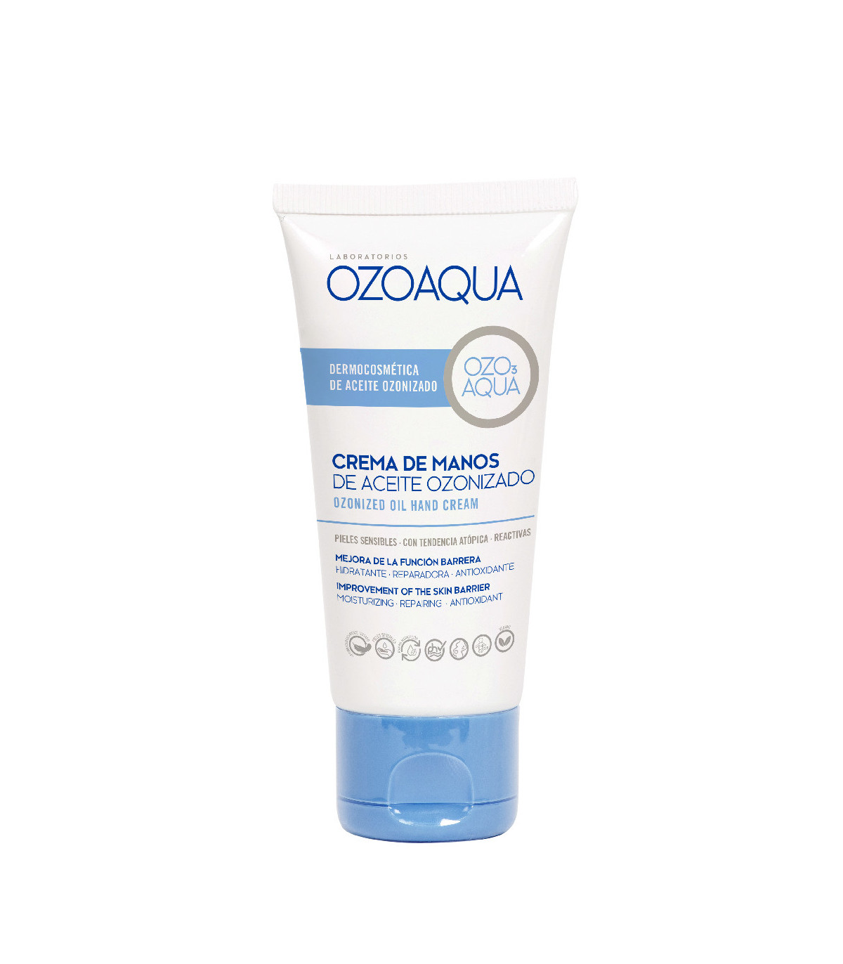 La Crema de manos de Aceite ozonizado OzoAqua está elaborada a base de Aceites Vegetales Ozonizados combinados con Urea, Alantoína, Glicerina, Aloe Vera, Betaína, Almidón de Arroz, Extracto de Caléndula, Extracto de Hamamelis, Tocopherol, Escualeno y β-Sitosterol.