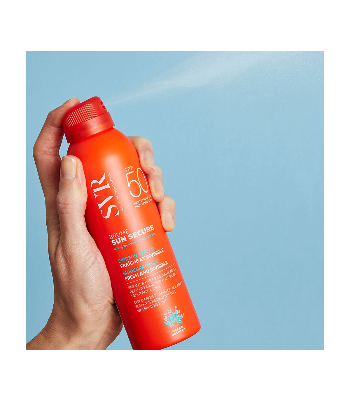 Bruma solar SPF50+ con textura ultraligera, invisible y de acabado seco. Protección UVA/UVB para rostro y cuerpo, fácil de aplicar gracias a su formato 360°.